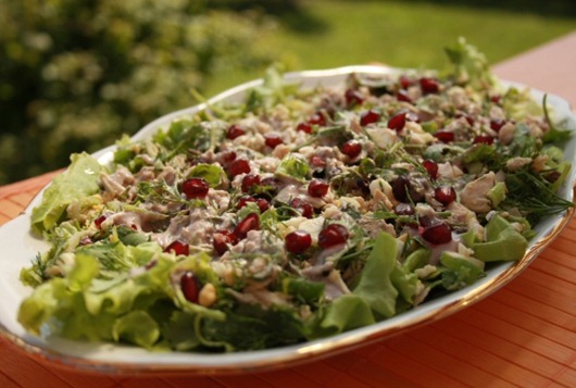 Именно в него я кладу то белое мясо курицы, которое в моей семье не очень любят, а в этом блюде оно улетает «на ура». Могу поспорить, что мало кто по вкусу этого салата определит, что соусом к нему служит заправка из грецких орехов. А какой взрыв вкуса дают зерна граната! В общем, у этого салата есть все шансы стать вашим супер-блюдом, просто однажды попробуйте его приготовить, и пусть все ахнут!