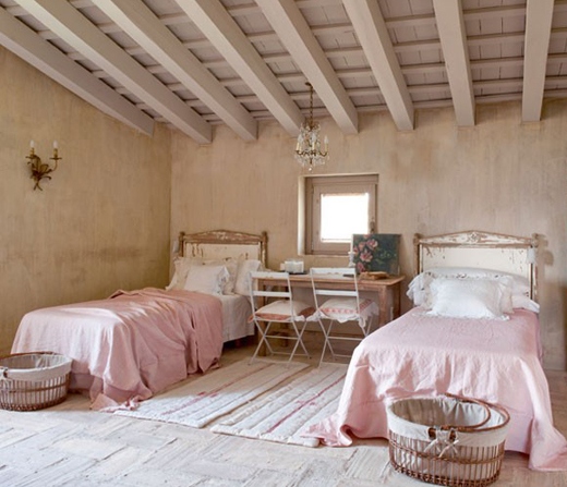 Потолки выкрашиваем белой краской, украшаем деревянными балками - темными для контраста или выбеленными. Балки должны быть выщербленными, с эффектом потемнения от времени.
