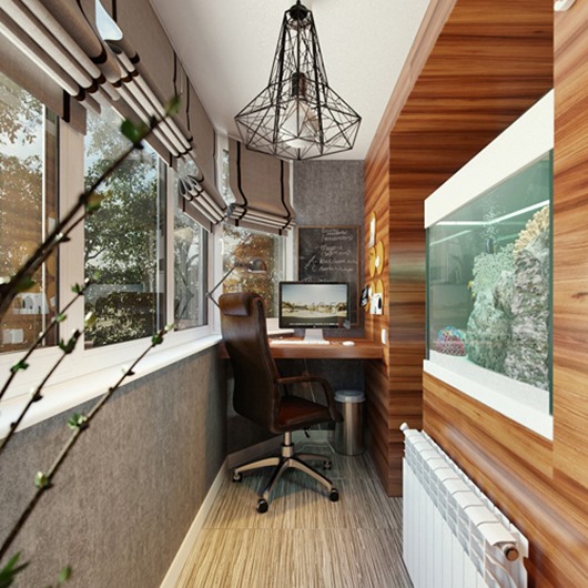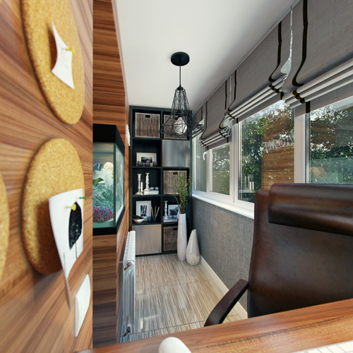 добавляем римские шторки серого цвета. На балконе лучше использовать шторы из плотной ткани. Это нужно для того чтобы была возможность в солнечный день работать за компьютером.